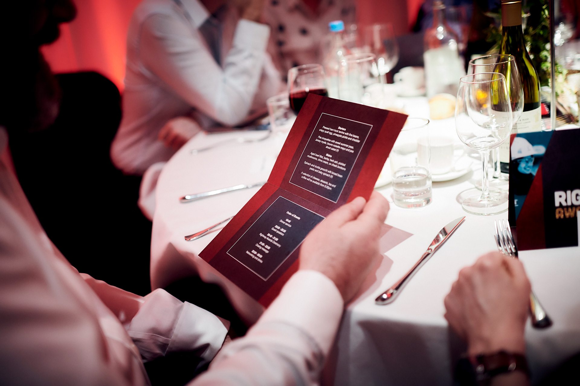 event collateral including banners, staging, table dressings, menus, and presentation slides.